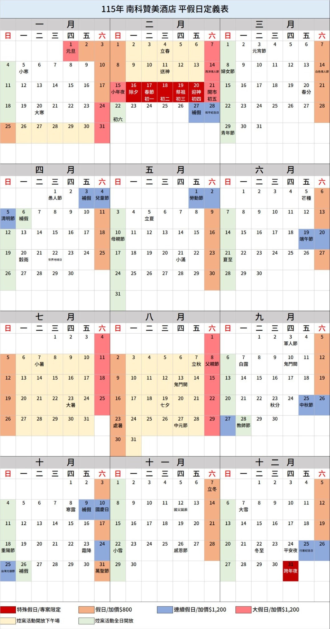 注意事項: 1.南科贊美酒店各例行活動日期依酒店公告為準。 2.本行事曆將視酒店活動及訂房狀況進行微調,若有調整,恕不另行通知。 3.平旺假日若有調整恕不另行通知,酒店訂房價格為浮動房價,請以官方網站訂房系統顯示房價為準。 4.持票券入住者,請依票券上之注意事項辦理加價事宜。