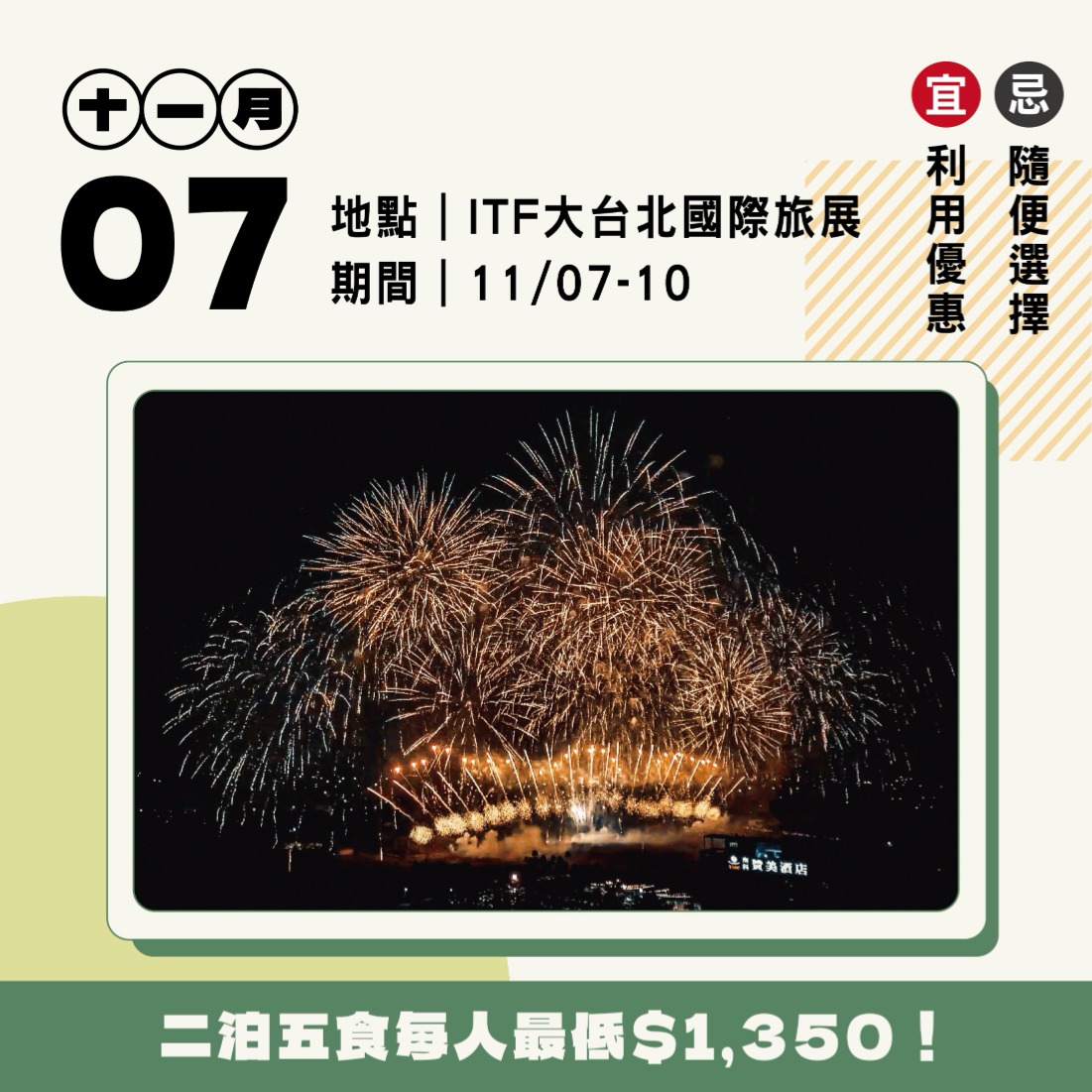 11.07 - 11.28,住宿券下殺33折.二泊五食每人只要$1,350元起