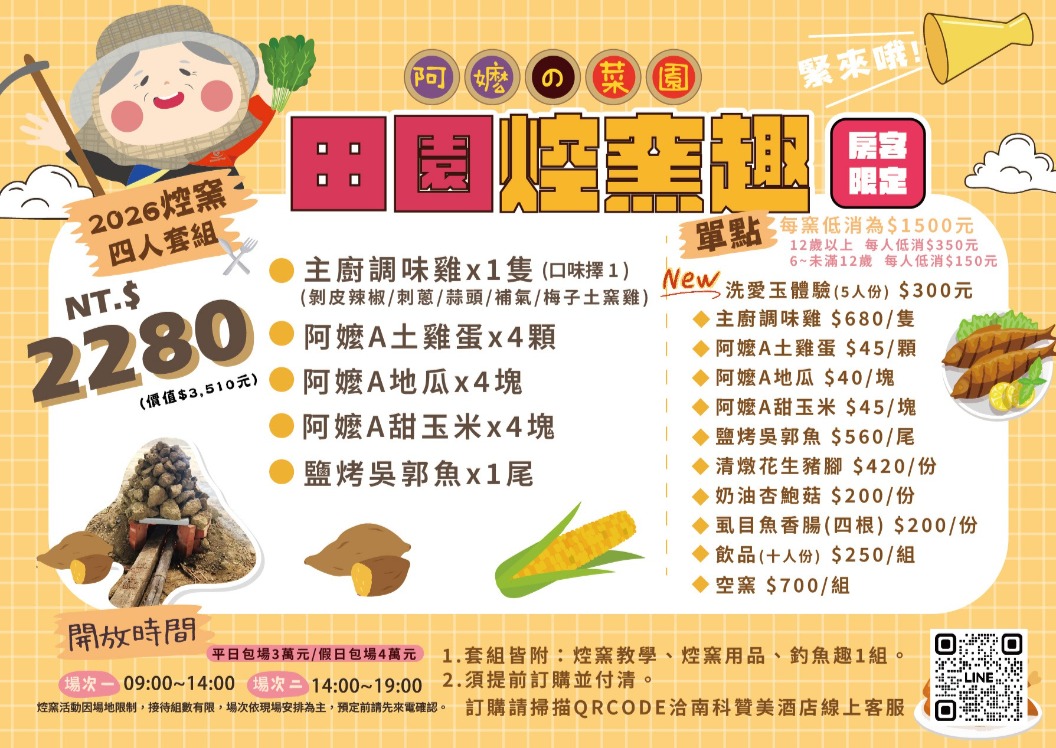 - 依專案房型提供阿嬤的菜園四人焢窯套組乙組。(含土窯雞乙隻、阿嬤的甜玉米4份、番薯四個、土雞蛋四顆、鹽焗吳郭魚一隻)。