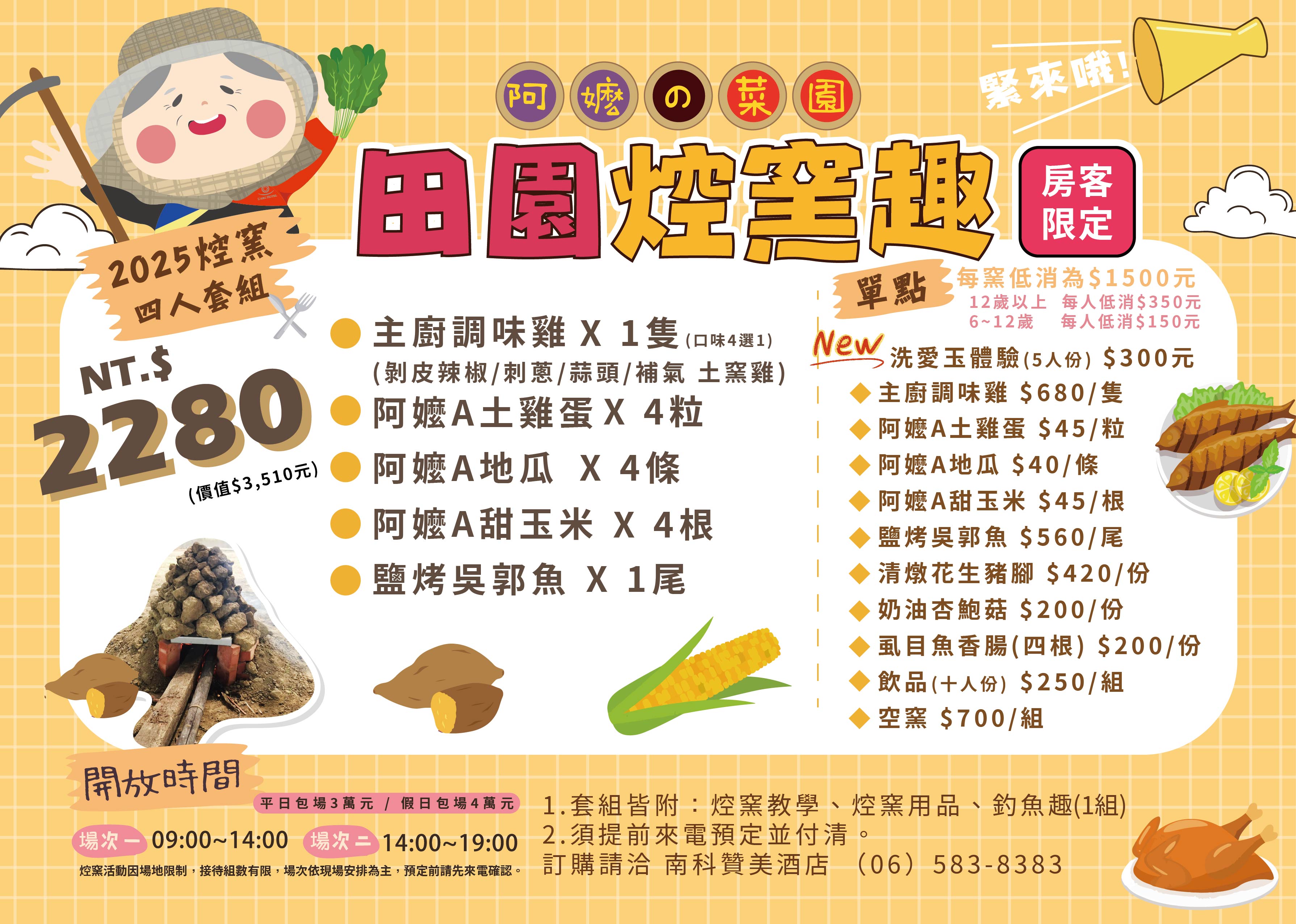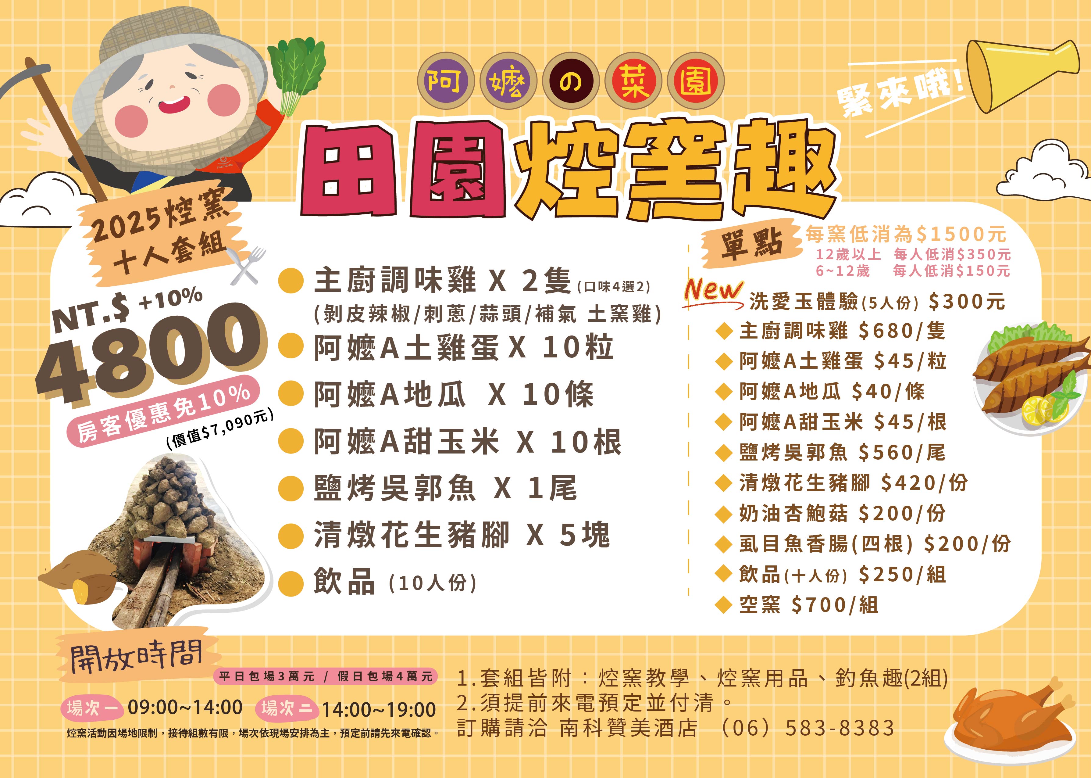 下午場 14:00-19:00 (周五/六/日)團體包場請來電洽詢,由贊美酒店的活動人員帶著大小朋友到專屬焢窯場地,享受自己從零開始親手DIY的美味焢窯餐點!